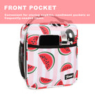 The insulated lunch bag is made of a durable fabric material that has a scrub texture, the inside has a thermal insulated layer that helps keep food and drinks cold for hours. It has a hand strap and a pocket on the front for storing utensils and napkins.