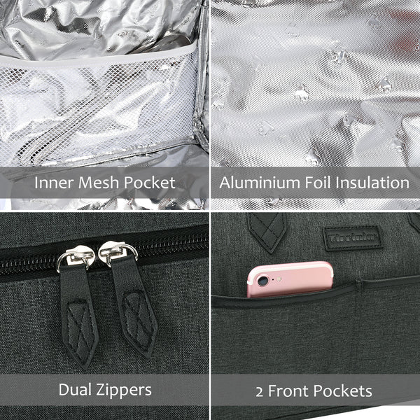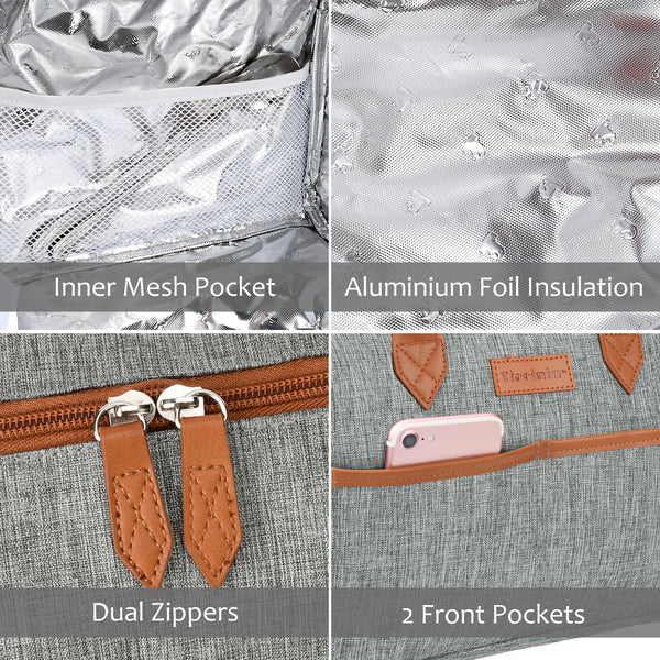 Durable oxford cloth and waterproof aluminum foil( BPA FREE). Thickened fabric and PE foam interlayer keep your lunch bag firm and your food cold or warm for about 4 hours.