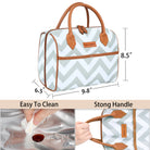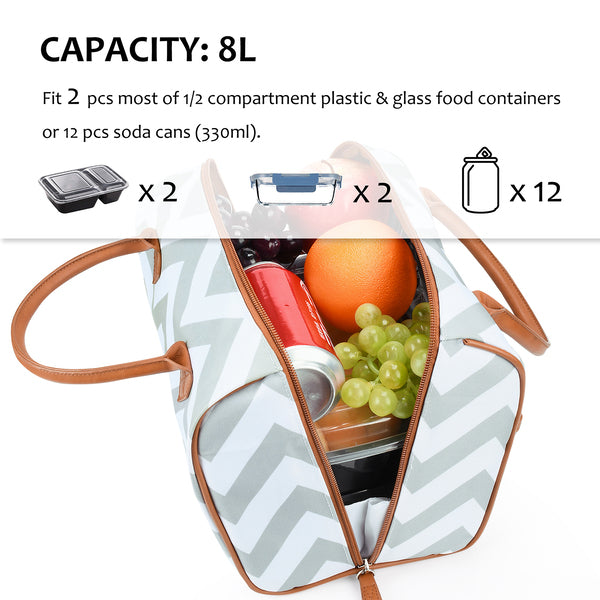 The retro classic polka dot design is romantic with nifty. White dots and black cloth collide to a tee. Make this lunch bag look very stylish. The leather handles let you quickly pick up and go. All of this makes it more than just a lunch cooler bag, but also like a ladies' handbag. It is a cool lunch bag for women, who are always in hurry but also care about the details.