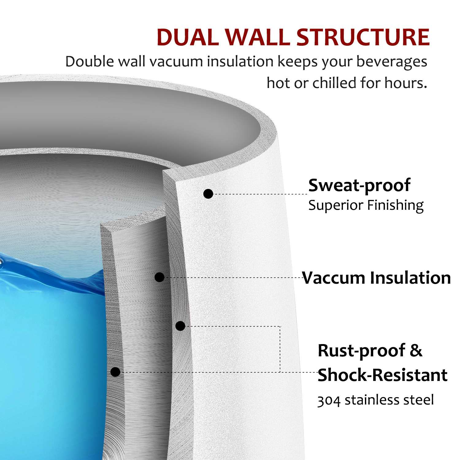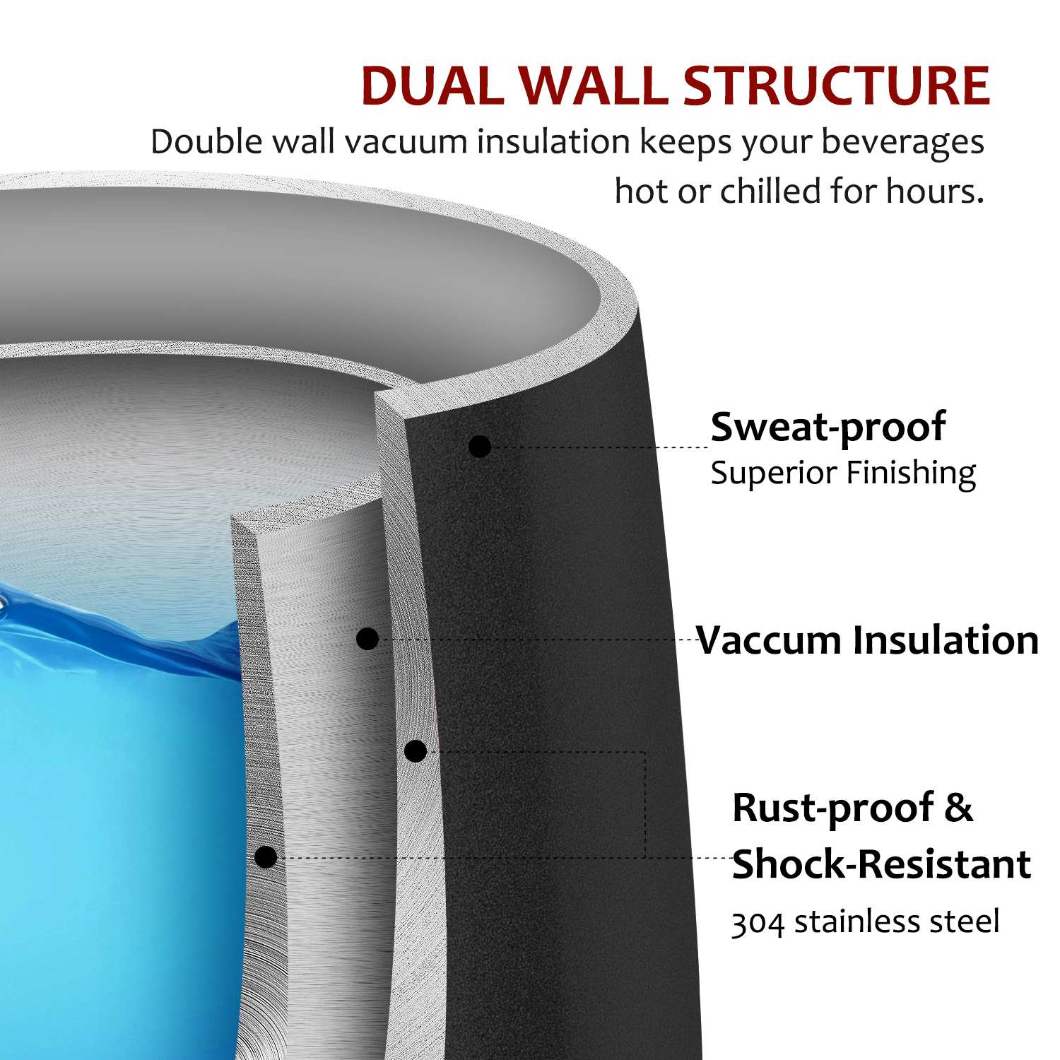- Hot or Cold for Hours: Double-walled 304 stainless steel with a vacuum gap prevents heat transfer, keeping drinks hot or cold for hours without a sweaty exterior.