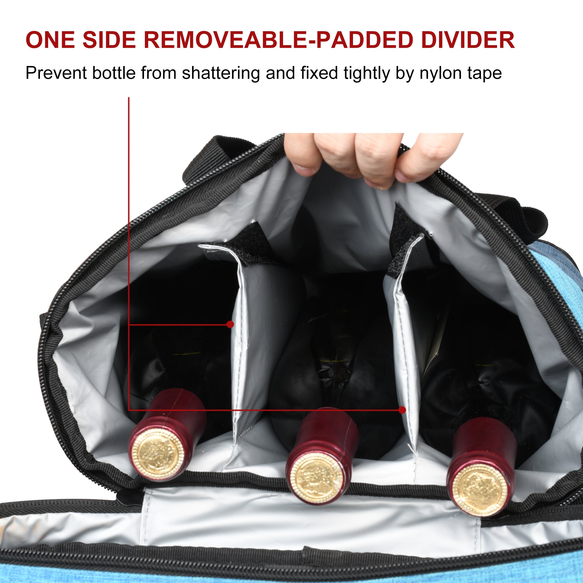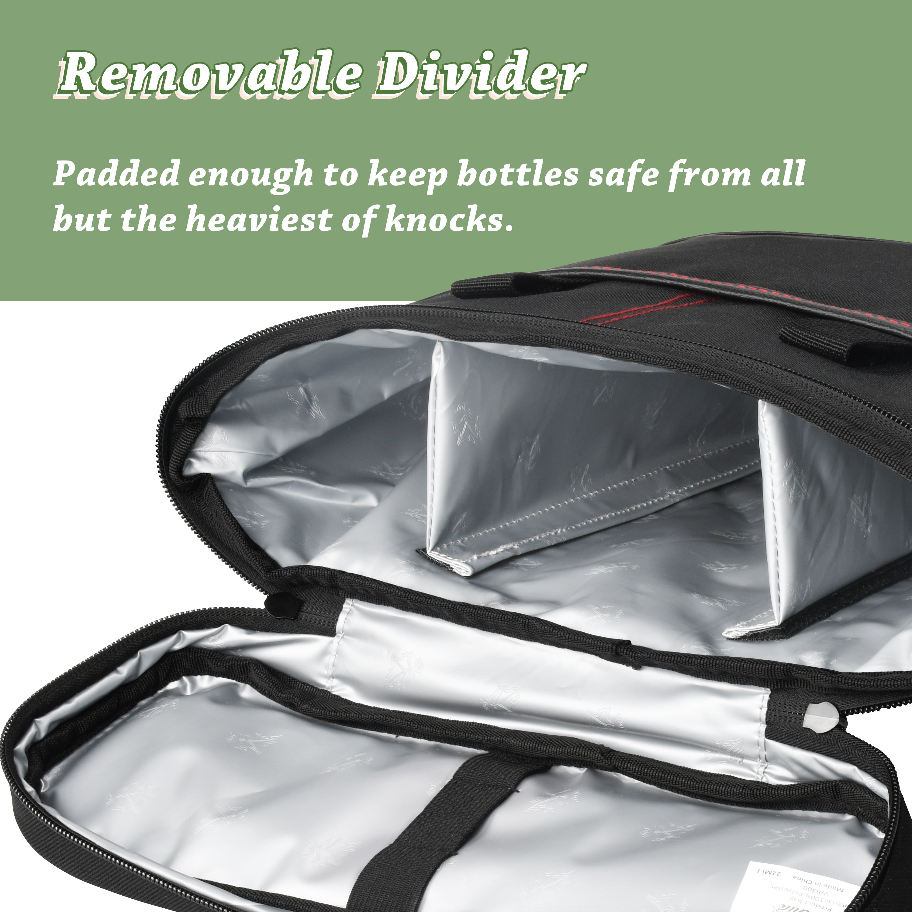The sturdy handle, adjustable shoulder strap, and stainless steel buckle of this wine cooler bag help you carry your wine anywhere. Tirrinia wine carrier is lightweight, durable, and insulated. It is made elaborately of durable 600D Polyester, insulated with PU material which is easy to clean and keeps the temperature cool for hours. It's also removable, you can use the wine bag as an insulated cooler bag and enjoy wines with your friends or families.