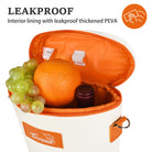 The inside lining is not fully waterproof. Use an ice pack if needed, but avoid placing loose ice directly inside the bag.