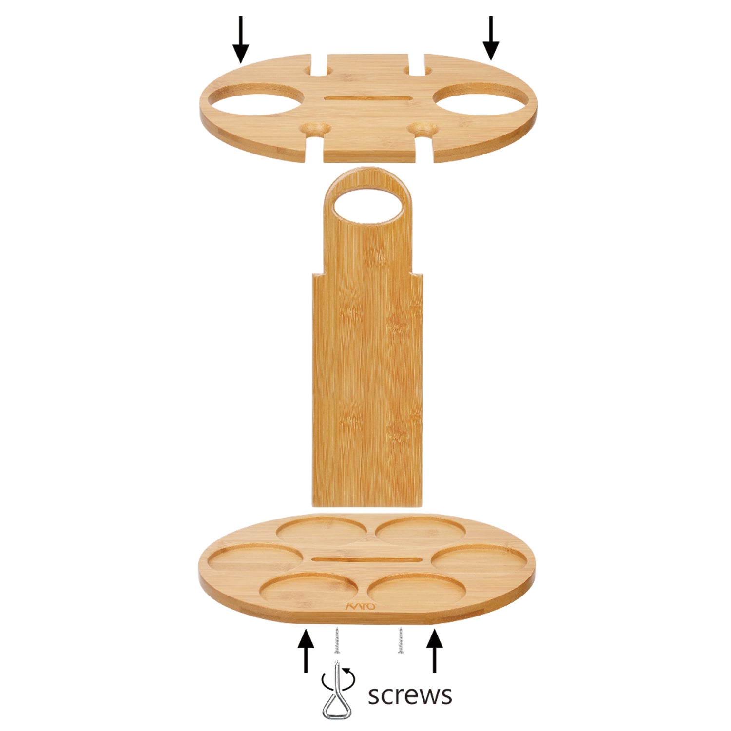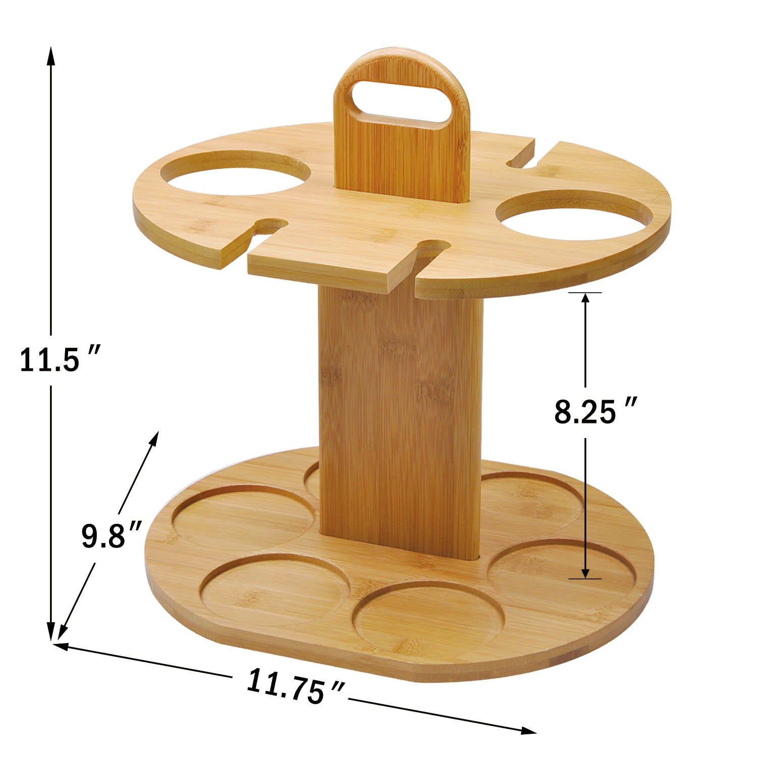 The wine glass bottle holder can hold 2 wine bottles and 4 stemmed glasses, including regular wine glasses, martini glasses, cocktail glasses, champagne glasses, and other stemware around 8" in height. This glass cup rack is 100% durable bamboo construction, and eco-friendly, guaranteed to last you a long time.
